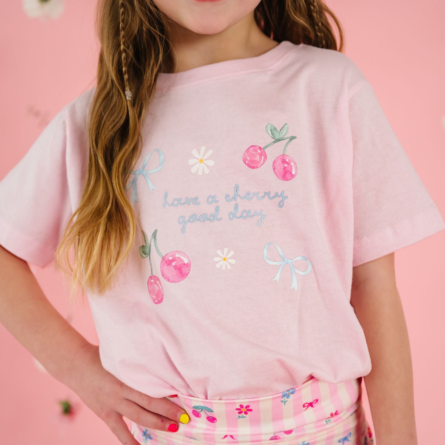 This sweet and playful pink graphic t-shirt from Sweet Wink is made for sunny days and cheerful moments. Featuring the phrase “Cherry Good Day” with charming cherries and dainty bow details, this tee adds the perfect pop of fun to any spring or summer outfit. Pair it with our Cherry Bow Athletic Skort for an effortlessly coordinated outfit that’s perfect for warm weather adventures, birthday parties and picture perfect days.